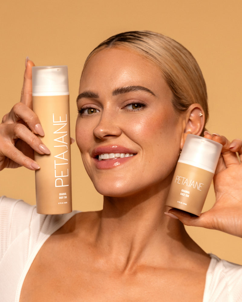 A complete collection of Peta Jane professional tanning products including mousses, mists, face tan, and application tools for wholesale.