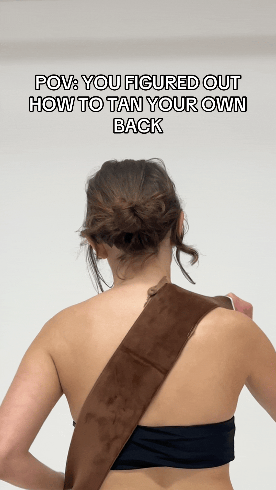 This is the most important part to successfully applying self-tanner on your back on your own: Apply the mousse DIRECTLY onto your skin on your back by reaching around with the bottle (see gif below).